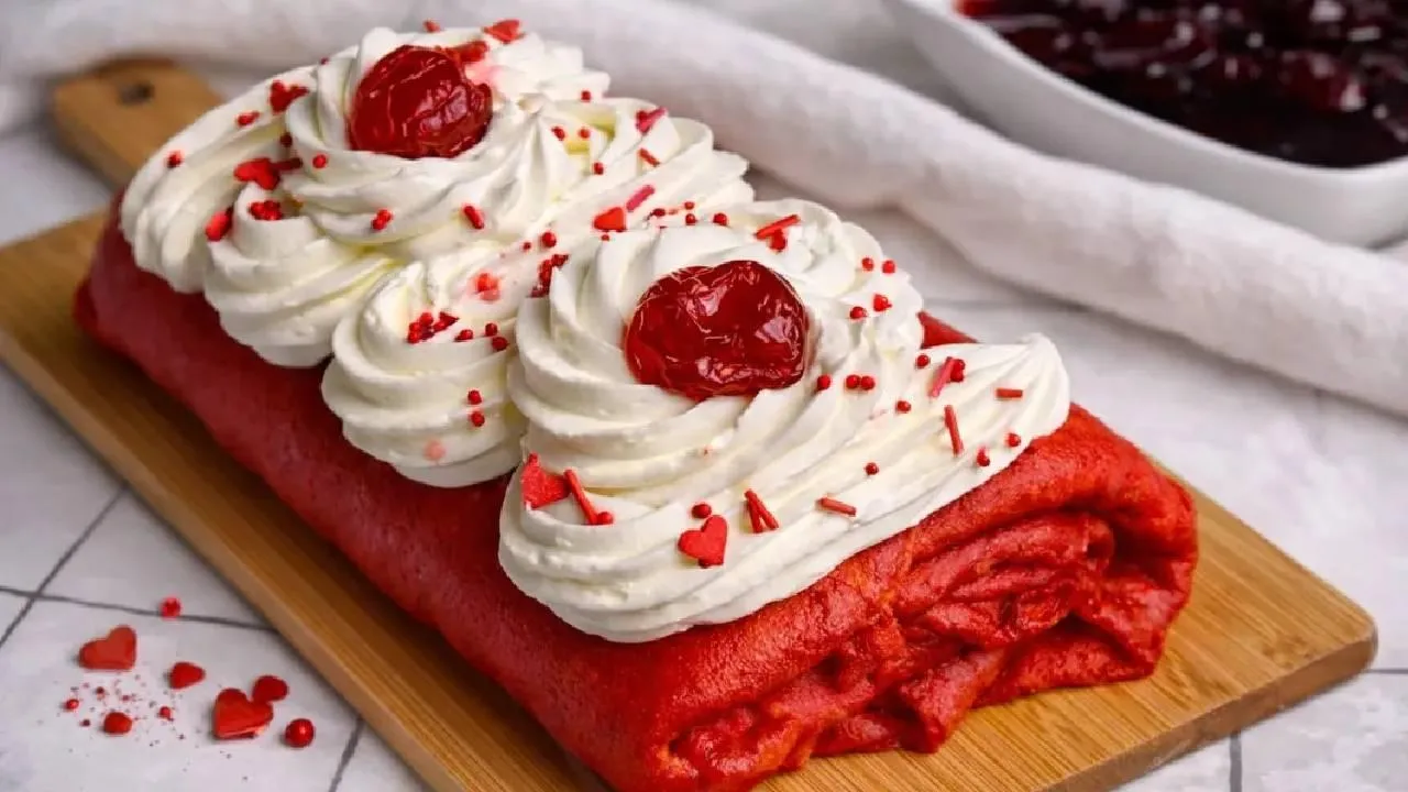 В готовое тесто добавить красный краситель, испечь 5–6 блинов. Вишню смешать с сахаром и крахмалом, уварить на медленном огне до загустения. Блины выложить внахлест, смазать кремом, распределить вишневую начинку и свернуть рулетом.