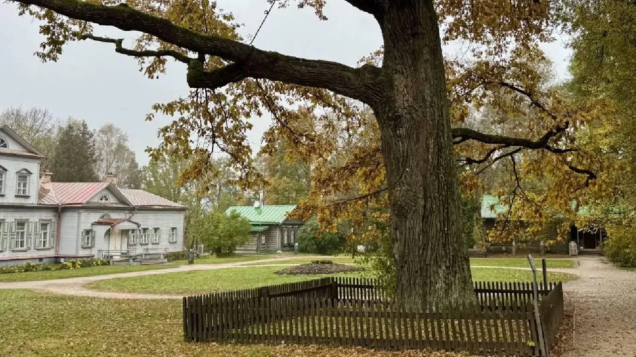 Историческое дерево стало свидетелем эпохи, когда в усадьбе проживали Николай Гоголь и Илья Репин. Возраст дуба достигает 225 лет, при этом его высота составляет 30 метров, а обхват ствола — 4,6 метра. В рамках осенних мероприятий специалисты осуществляют комплекс работ по сохранению раритета: выполняют санитарную обрезку сухих ветвей и проводят витаминную подкормку корневой системы. Эти процедуры укрепляют жизненные силы дерева перед предстоящими зимними морозами.