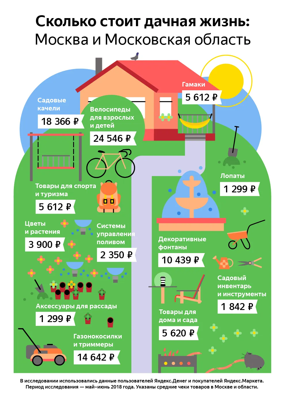 В расчетах учитывались данные о платежах через Яндекс.Кассу и покупках на Яндекс.Маркете за май-июнь 2018 года. В ценник вошли инструменты для сада и огорода, растения для посадки, велосипеды, гамаки и многие другие вещи для дачной жизни.