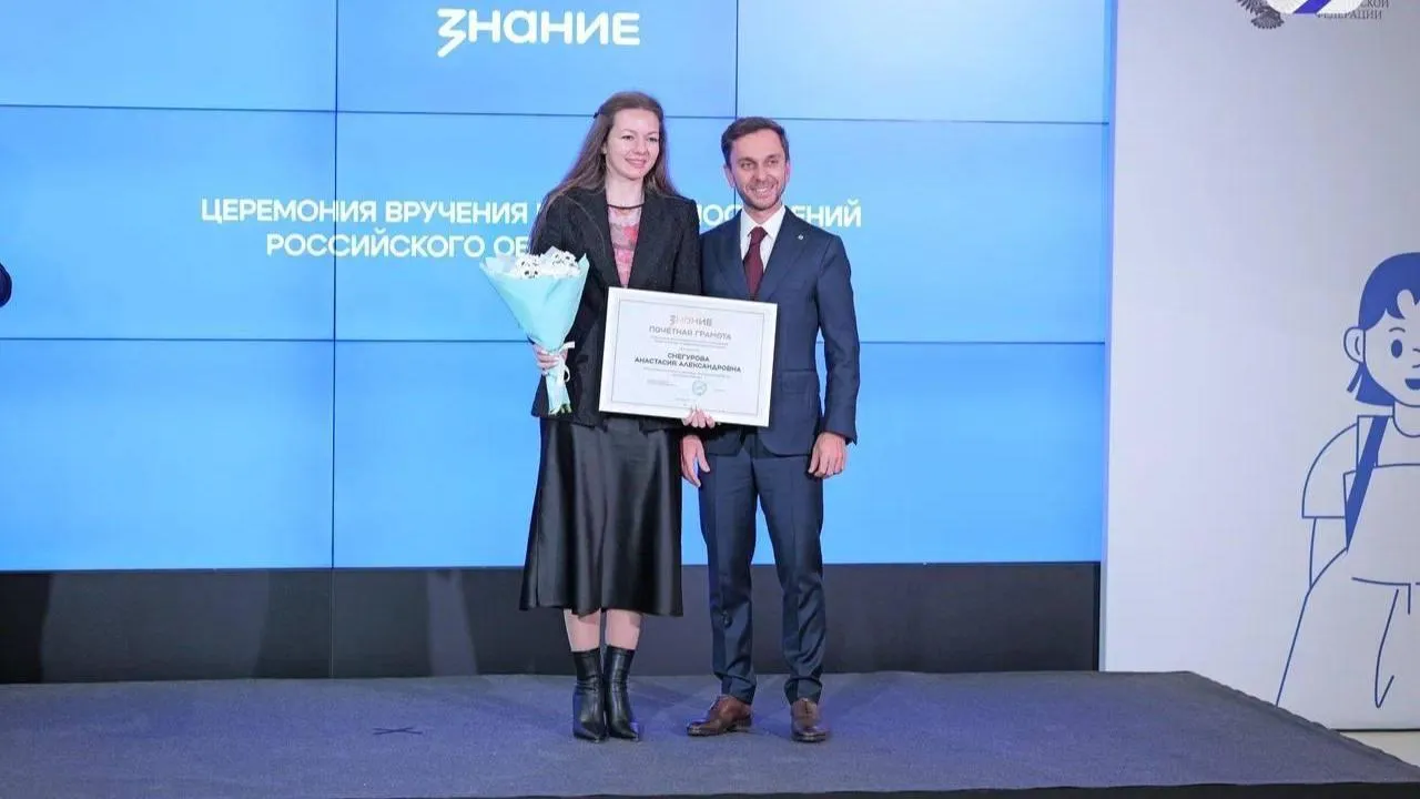 Председатель родительского комитета при Министерстве образования Московской области Анастасия Снегурова получила грамоту общества «Знание» за вклад в реализацию просветительских проектов.