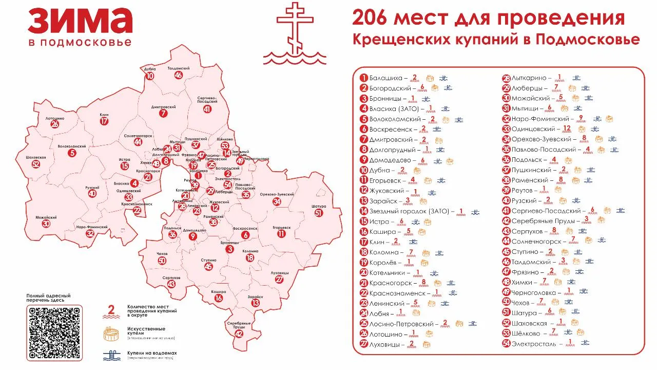 В Министерстве благоустройства Московской области представили полный список оборудованных купелей для крещенских купаний. В него включены 206 объектов.