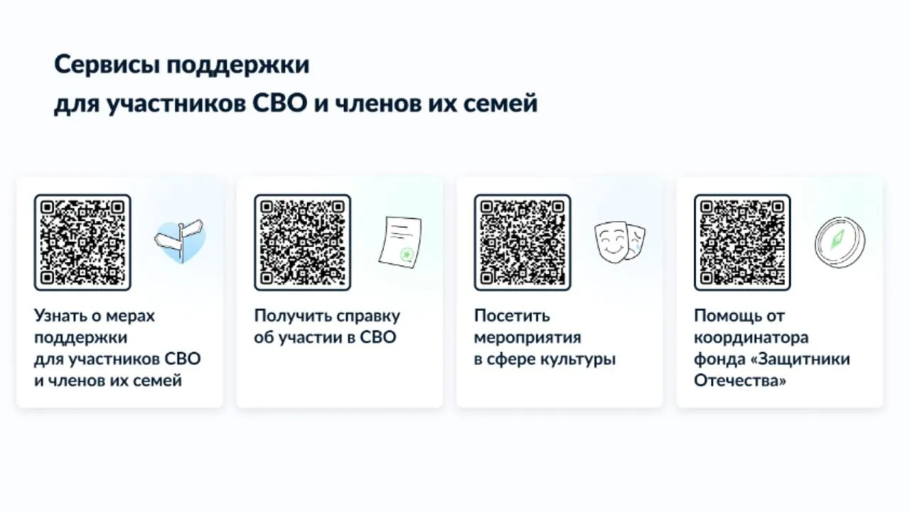 Макет содержит несколько QR-кодов, которые ведут на информационные ресурсы о доступных мерах поддержки, культурных мероприятиях, порядке получения справки об участии в СВО и помощи от фонда «Защитники Отечества».
