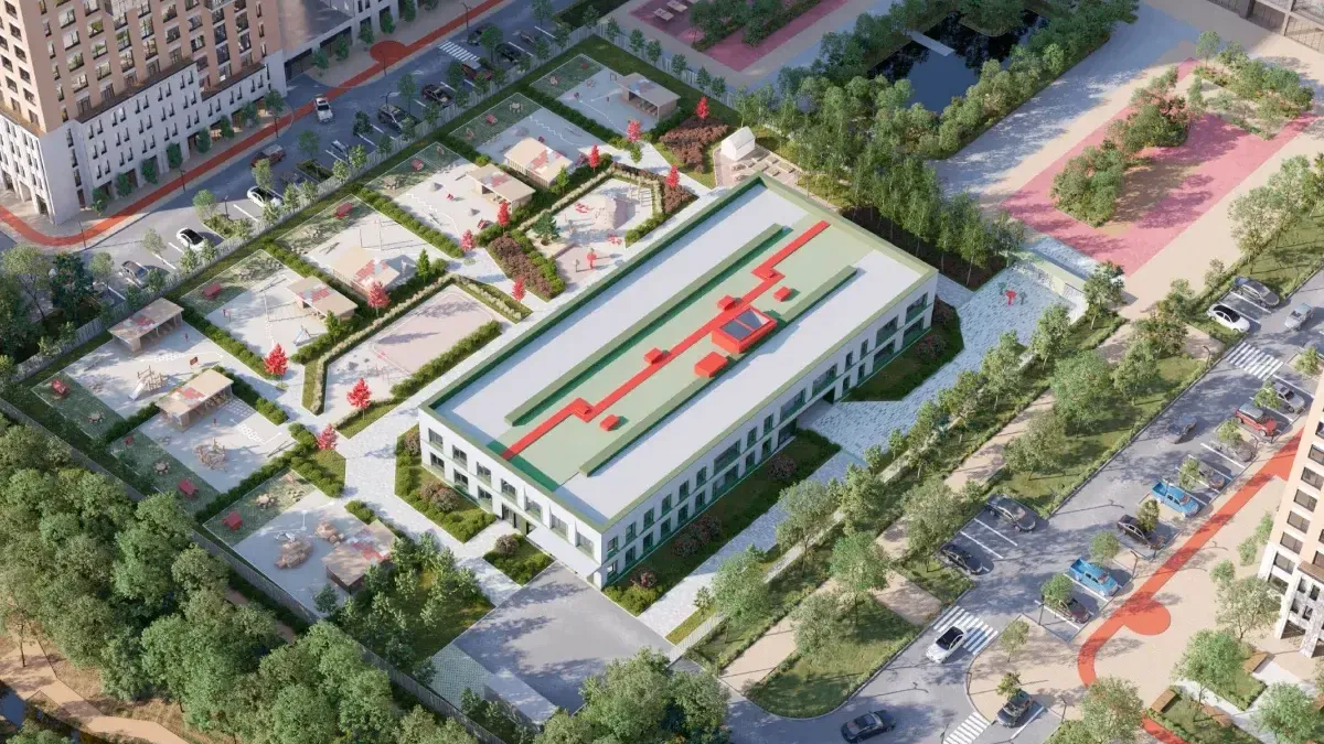 Вблизи детского сада появятся событийная площадь с арт-объектом и фонтаном, игровые площадки для разных возрастных групп, физкультурная зона, теплица и огороды для детских опытов.