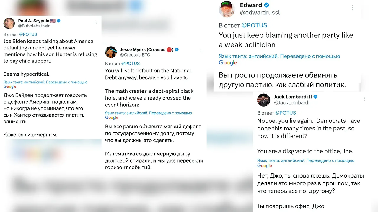 «Вы говорите MAGA, как будто это что-то плохое. Я не могу дождаться, когда вы уйдете со своего поста»; «Вы все равно объявите мягкий дефолт по государственному долгу, потому что вы должны это сделать. Математика создает черную дыру долговой спирали, и мы уже пересекли горизонт событий»; «Джо Байден продолжает говорить о дефолте Америки по долгам, но никогда не упоминает, что его сын Хантер отказывается платить алименты. Кажется лицемерным», – пишут комментаторы.