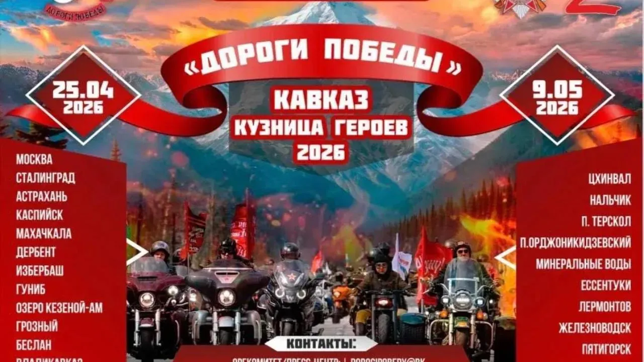 Одиннадцатый международный мотомарш «Дороги Победы — Кавказ кузница героев 2026» стартует 25 апреля в Москве. Он завершится 9 мая в Пятигорске, сообщили организаторы.