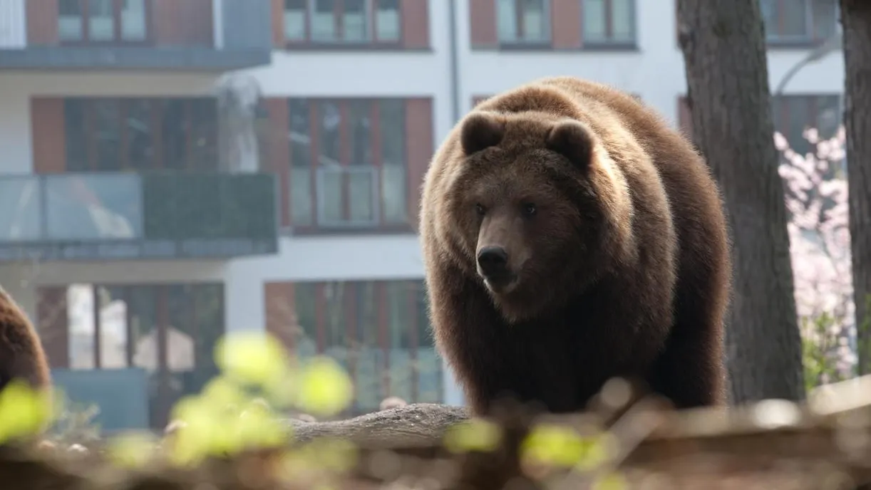 Ироничным фоном для дикого зверя служили праздничные украшения: позади медведя светились два снеговика, являвшиеся частью рождественских декораций. Наибольшее волнение у наблюдавших вызвал момент, когда животное поднялось на задние лапы. «Смотри, смотри», — восклицает в этот момент женский голос.