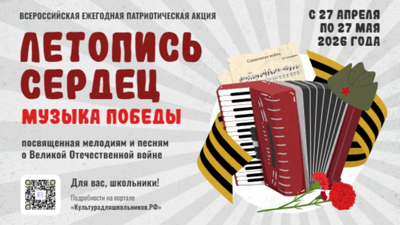 С 27 апреля по 27 мая 2026 года в рамках межведомственного культурно-образовательного проекта «Культура для школьников» проходит Всероссийская ежегодная патриотическая акция «Летопись сердец. Музыка Победы». В этом году она посвящена известным мелодиям и песням