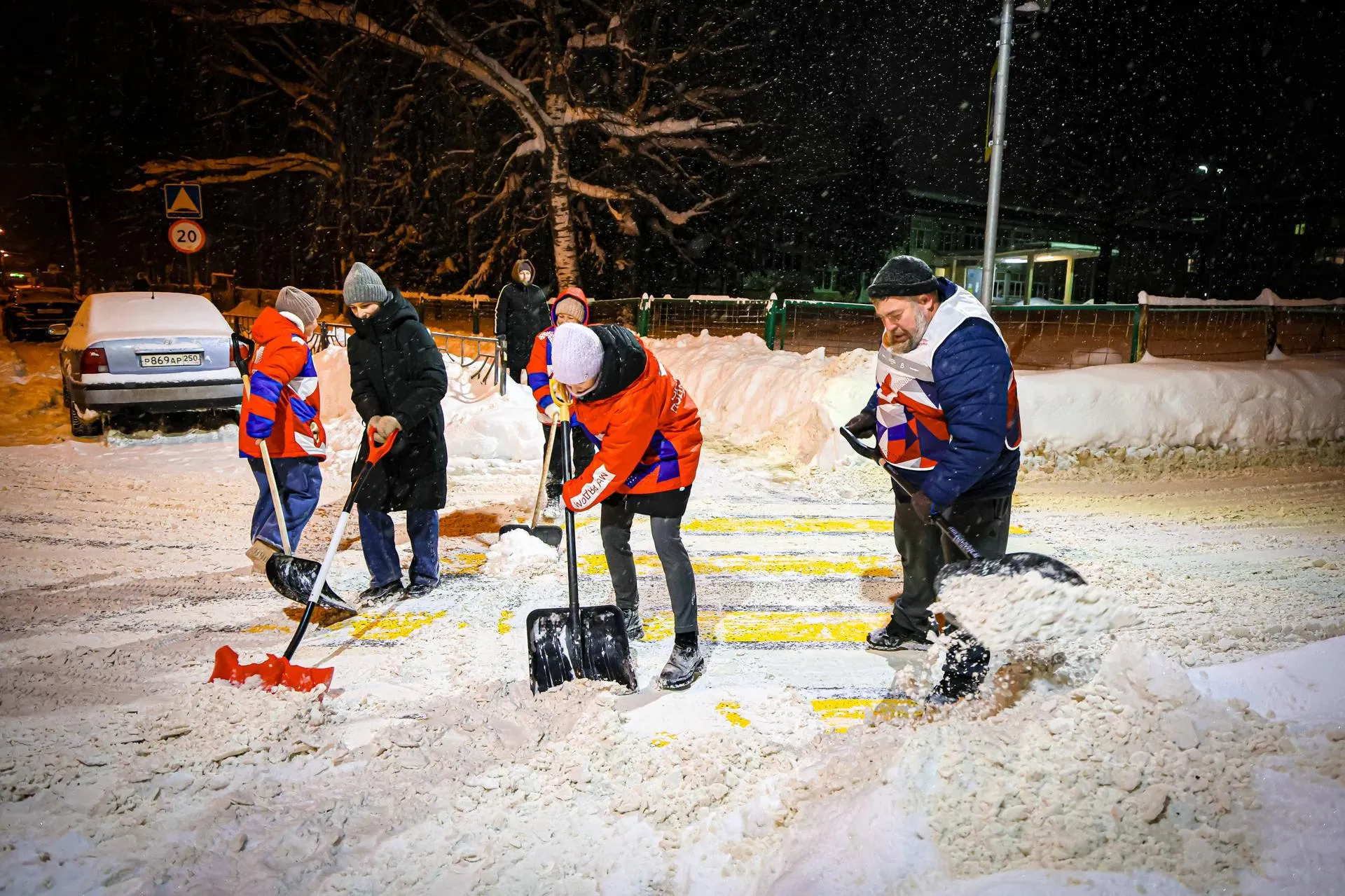 За полтора часа — чистые тротуары: клинские волонтеры провели вечернюю снежную операцию